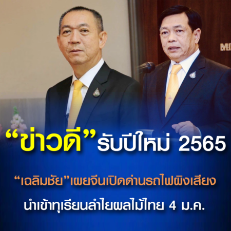 ข่าวดีรับปีใหม่ 2565 “เฉลิมชัย”เผยจีนเปิดด่านรถไฟผิงเสียงนำเข้าทุเรียนลำไยผลไม้ไทย 4 ม.ค. “อลงกรณ์”ขอความร่วมมือผู้ส่งออกตรวจเข้มระวังโควิดปนเปื้อน
