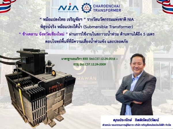 “ หม้อแปลงไทย เจริญชัยฯ ” รางวัลนวัตกรรมแห่งชาติ NiA พิสูจน์จริง หม้อแปลงใต้น้ำ (Submersible Transformer) “ ช้างคลาน จังหวัดเชียงใหม่ ”