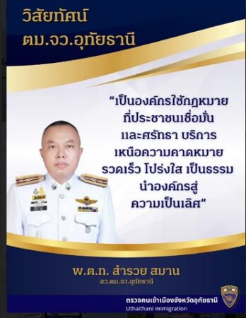 ปณิธาน ความมุ่งมั่นของ ตม.จว.อุทัยธานี “เป็นองค์กรใช้กฎหมาย ที่ประชาชนเชื่อมั่น และศรัทธา บริการ เหนือความคาดหมาย รวดเร็ว โปร่งใส เป็นธรรม นำองค์กรสู่ ความเป็นเลิศ”