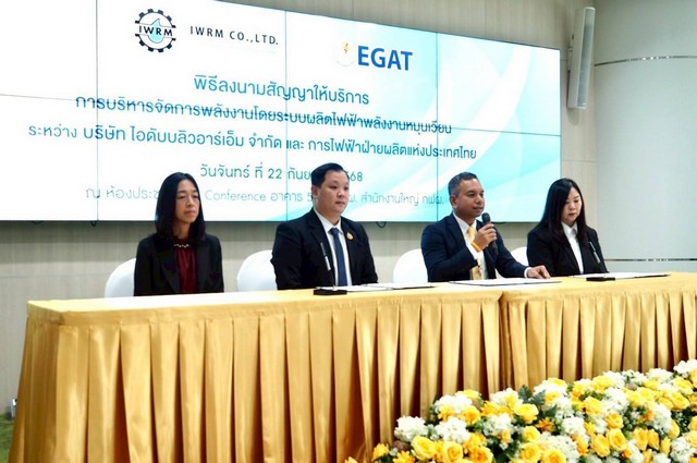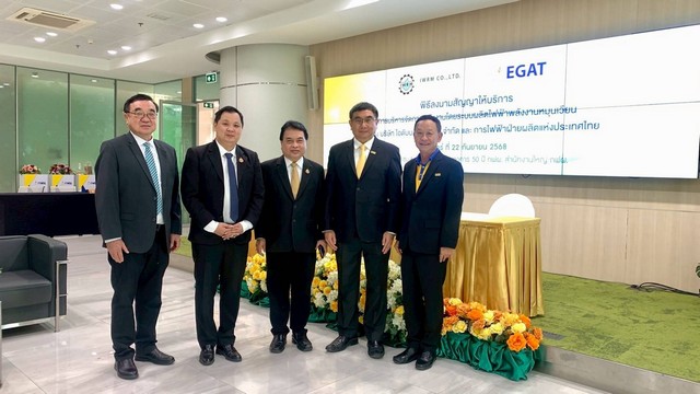 เมื่อวันที่ 22 กันยายน 2568 นายเมธาวัจน์ พงศ์รดาภิรมย์ รองผู้ว่าการธุรกิจเกี่ยวเนื่อง (รวธ.) การไฟฟ้าฝ่ายผลิตแห่งประเทศไทย (กฟผ.) ร่วมเป็นเกียรติในงานลงนามสัญญา (MOU) ให้บริการบริหารจัดการพลังงานโดยระบบผลิตไฟฟ้าพลังงานหมุนเวียน ระหว่าง กฟผ.และ บริษัท ไอดับบลิวอาร์เอ็ม จำกัด (IWRM) ผู้ให้บริการน้ำเพื่ออุตสาหกรรมรายใหญ่ในพื้นที่ ระเบียงเศรษฐกิจภาคตะวันออก (EEC) โดยมีนายสายัณห์ ปานซัง ผู้ช่วยผู้ว่าการบริหารธุรกิจ (ชธก.) และนายธนวัฒน์ สันตินรนนท์ กรรมการผู้จัดการ IWRM ร่วมลงนามในสัญญา พร้อมด้วยนางณิศรา ธัมมะปาละ ผู้อำนวยการฝ่ายจัดการธุรกิจนวัตกรรมพลังงาน (อธพ.) และนางอัมพวัน พงศ์สิทธิศักดิ์ ประธานเจ้าหน้าที่ฝ่ายปฏิบัติการ IWRM ลงนามในฐานะพยาน ณ ห้อง Press Conference สำนักงานใหญ่ กฟผ. จ.นนทบุรี