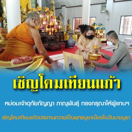 หม่อมเจ้าอุทัยกัญญา ภาณุพันธุ์ ทรงกรุณาให้ผู้แทนฯ เชิญโคมเทียนแก้วประทาน จำนวน 8 ชุด นำเชิ…